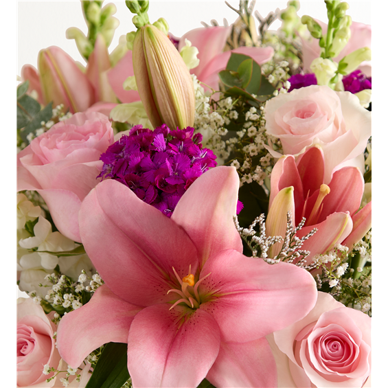 A dazzling gathering of pink and purple, this bouquet will delight all the marvelous moms in your life. Our florists artistically arrange farm-fresh roses, Asiatic lilies, and other blooms to create a gift that expresses your love and appreciation in a way words never could.